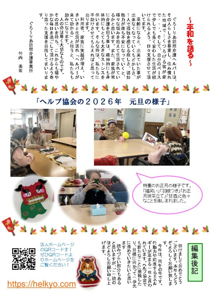 みんなのたより新年号 2026 1/19 みんなのたより 2026年1月19日 2026年1月19日 みんなのたより 『ぐろ~りあデイ通信 12月号』 関連記事 みんなのたより7月号 2025年7月8日 みんなのたより59号 2025年4月15日 みんなのたより58号 2025年1月7日 みんなのたより10月号 2024年10月8日 みんなのたより8月号 2024年9月11日 2024年発刊 No.54 みんなのたより 2024年1月31日 2023年発刊 No.53 みんなのたより 2024年1月30日 2023年発刊 No.52 みんなのたより 2024年1月30日 コメント コメントする コメントをキャンセルコメント ※ 名前 ※ メール ※ サイト 次回のコメントで使用するためブラウザーに自分の名前、メールアドレス、サイトを保存する。